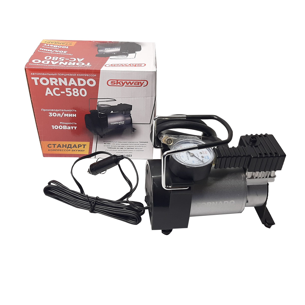 Компрессор металлический 30 л/мин в прикуриватель ТОРНАДО АС-580 СТАНДАРТ SKYWAY используется для подкачки шин, предметов бытового назначения, игрушек и прочих изделий. Имеет мощный электродвигатель и повышенную систему безопасности. Металлические части основных деталей, а также подшипники обеспечивают надежность, долговечность и высокий ресурс работы компрессора. Устройство рассчитано на длительную эксплуатацию в суровых климатических условиях. Детали, которые подвергаются трению, обработаны специальной смазкой. Благодаря амортизационной опоре, компрессор устоит на любой поверхности. Компрессор может оказаться незаменимым помощником на даче или пикнике, так как в комплекте имеются различные переходники для накачивания надувных матрасов, резиновых лодок и мячей. Для удобства хранения и переноски компрессор укомплектован сумкой. Позвольте себе высокое качество по доступной цене!